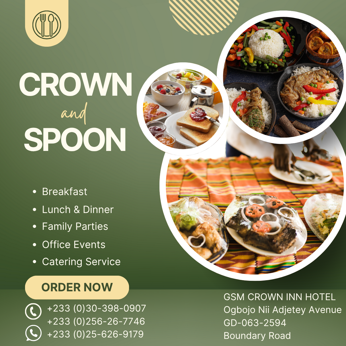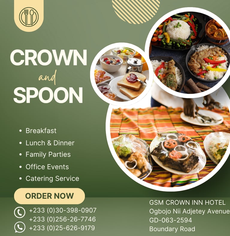 Join us and experience the perfect blend of Ghanaian hospitality and delightful cuisine. We look forward to serving you!